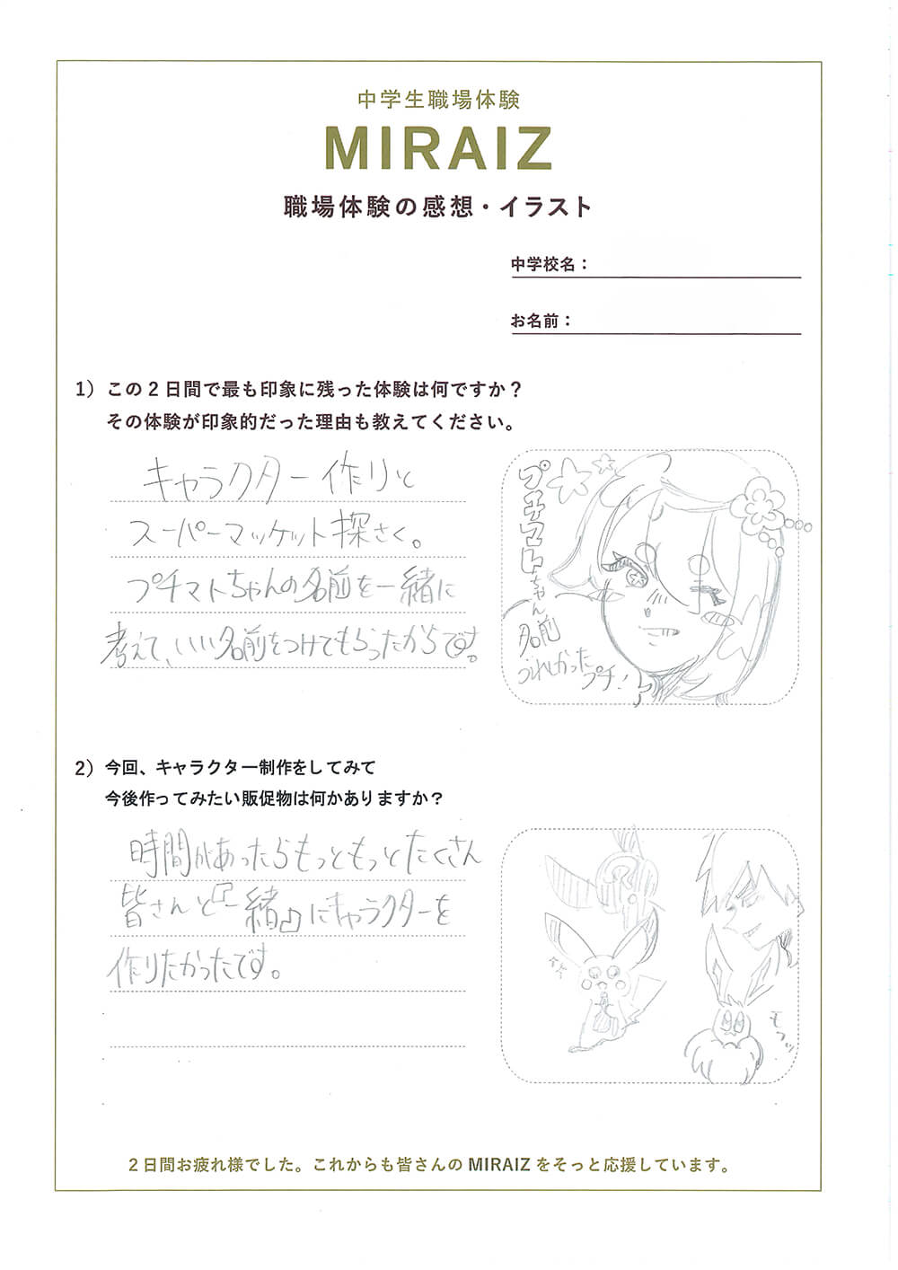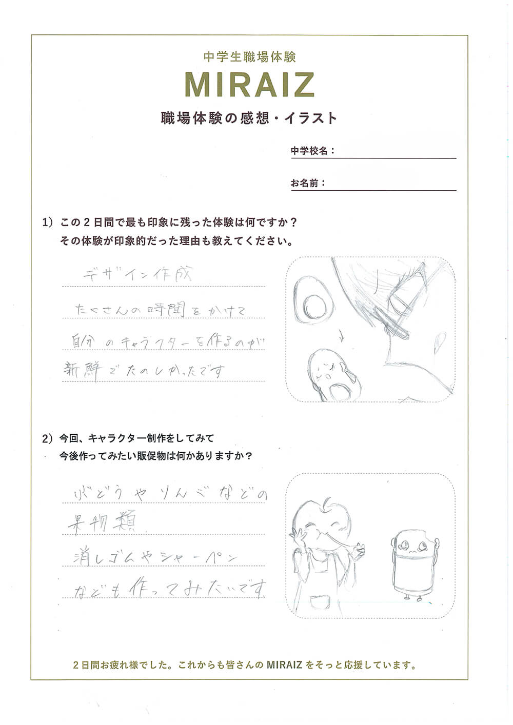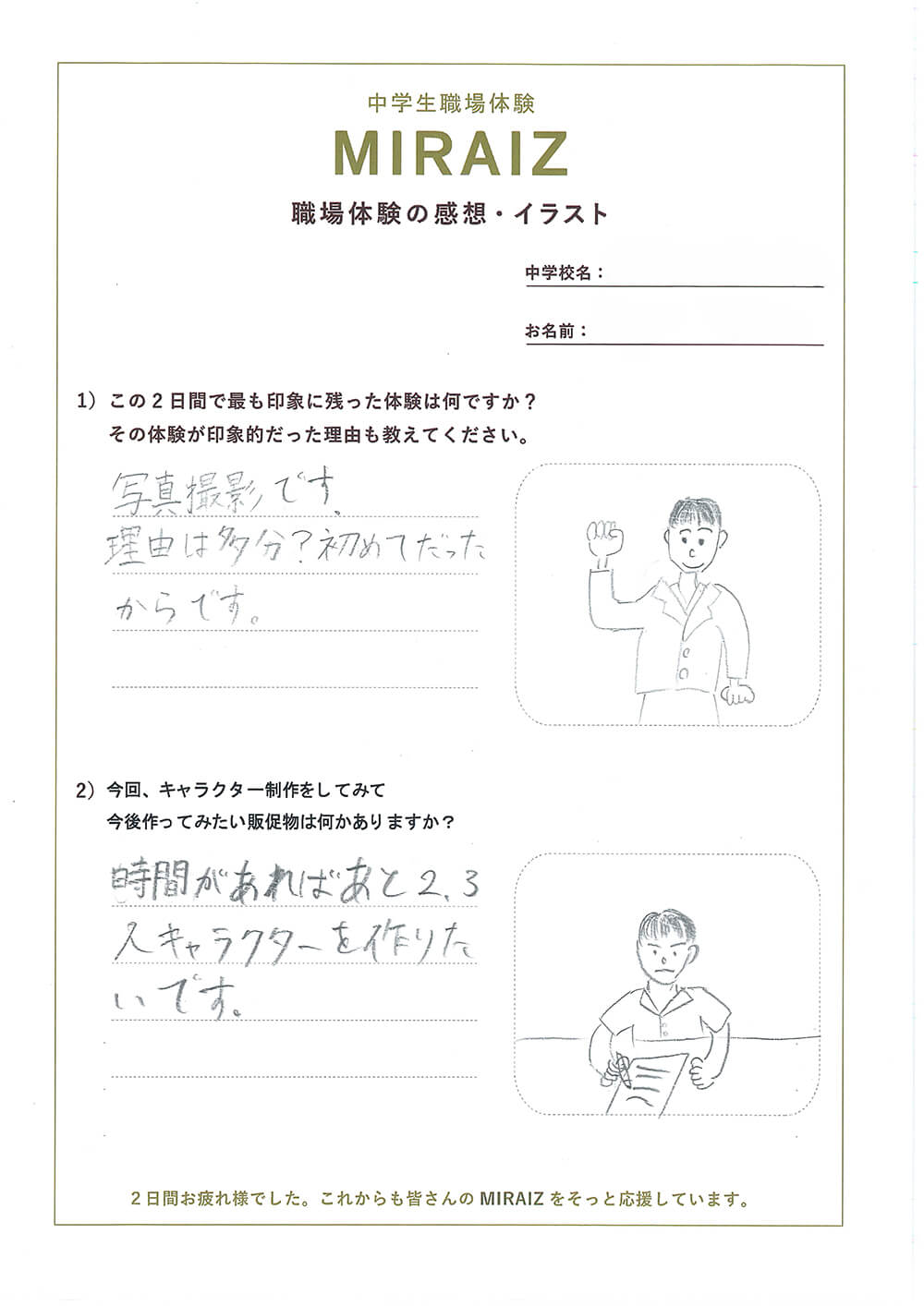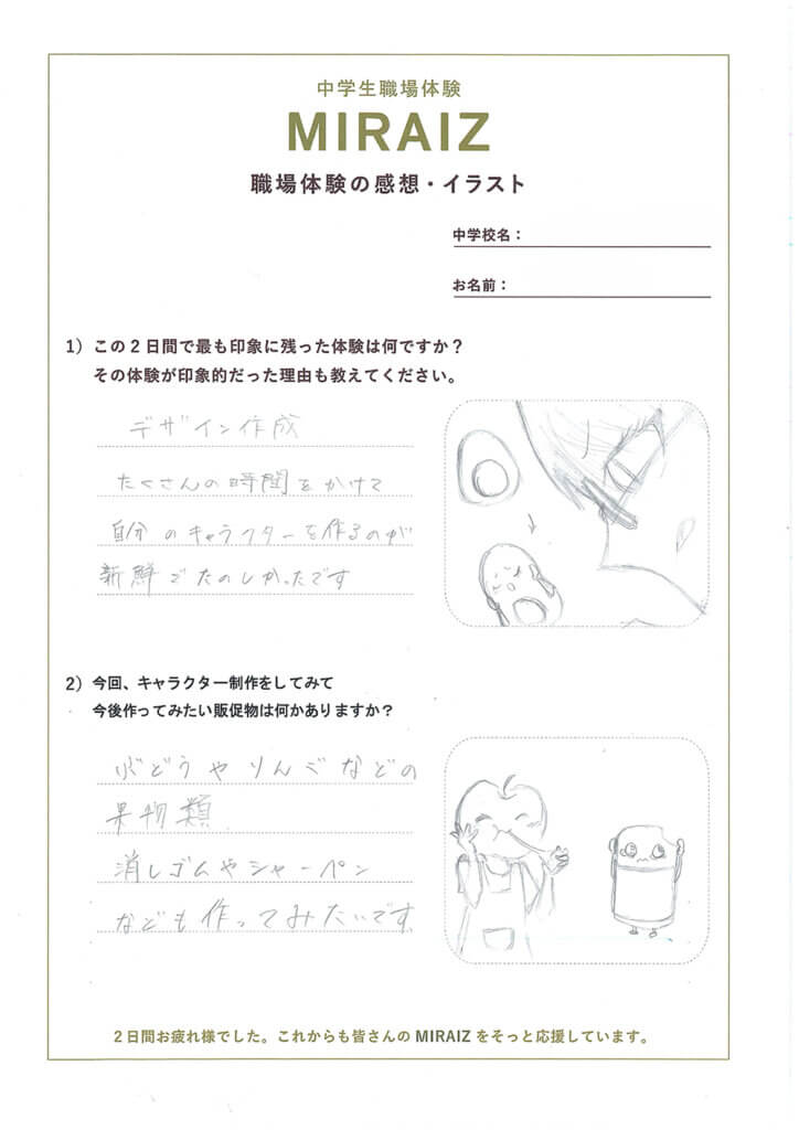 職場体験の締めくくりに感想とイラストをかいてもらいました