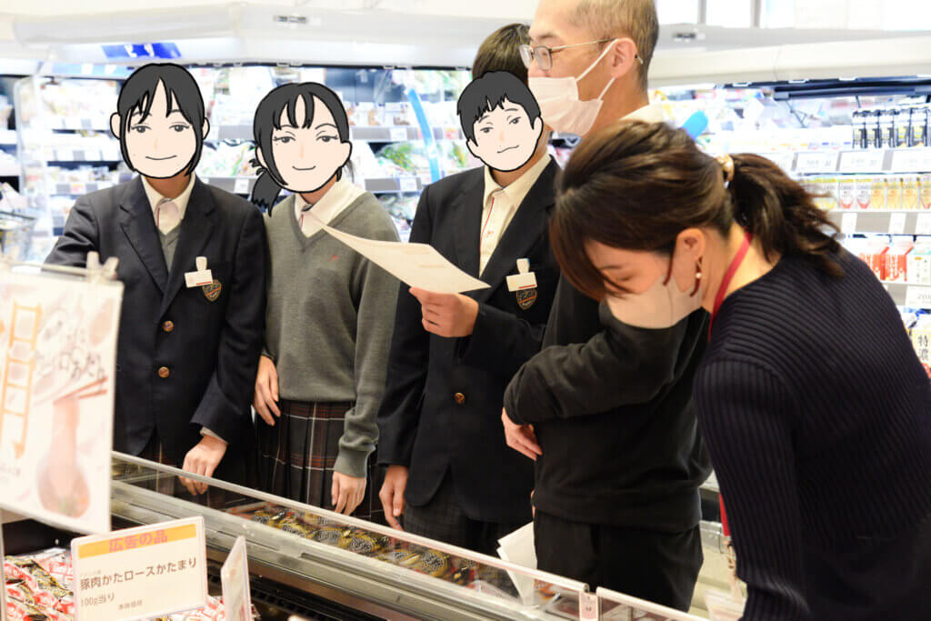 初日は、KOHYO様の本部の方が駆けつけ、上本町店の店長とともに温かく中学生を迎えてくださいました。生徒たちは人生初の名刺交換に挑戦し、緊張しながらも笑顔で挨拶しました。その後、本部の方と店長の案内役で、上本町店の売場視察がスタート。野菜・鮮魚・精肉・お惣菜コーナーを巡りながら、売場づくりの工夫や陳列のポイントを丁寧に説明していただきました。生徒たちは熱心に質問を投げかけており、現場ならではの学びに、視察は大きな刺激となったようです。