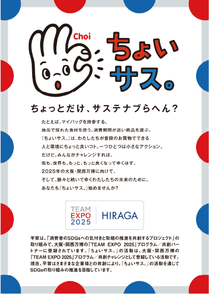 大阪・関西万博「TEAM EXPO 2025」プログラム 共創チャレンジに参画。毎日の「お買い物」を通じて、SDGs達成に向けた取り組みを身近に感じ、一人ひとりが行動を起こすきっかけを提供する「ちょいサス。」プロジェクトを展開しています。